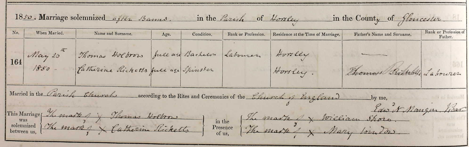On the marriage certificate, Thomas’ father’s information is left blank. This implies heavily that Thomas was illegitimate (of course, his father could have died when he was young and he was bought up by a stepfather). Looking into the witnesses – William and Mary – was of no help. They were actually the next couple to be married in Horsley and researching their families back 3 generations shows no links to any known Holbrow lines.