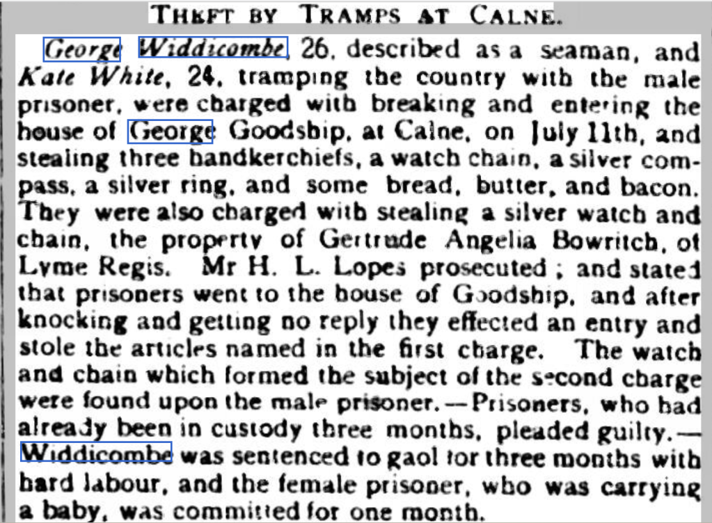 I was surprised at the information available for George and Kate. I don’t know why he left his ship, or what happened to stop him returning to sea and set his life in that direction. (There is the possibility that he arrived in New Zealand in the 1880s and made a nuisance of himself there by joining up with the Skeleton Army – a mob that was violently against the Salvation Army – but I can’t prove that the George Widdicombe that appears in police records there is this George Widdicombe.) Although his father died when he was fairly young, his brother and his sisters all found suitable marriages and/or careers. You never know what you’re going to find, however, even picking on an article about “tramps”.
